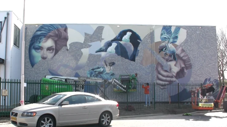 HEESBEEN – In Heesbeen wordt hard gewerkt aan een muurschildering op een nieuw streekarchief. De schildering wordt gemaakt door stichting Kings of Colors uit Den Bosch en moet de geschiedenis van de regio samenvatten.