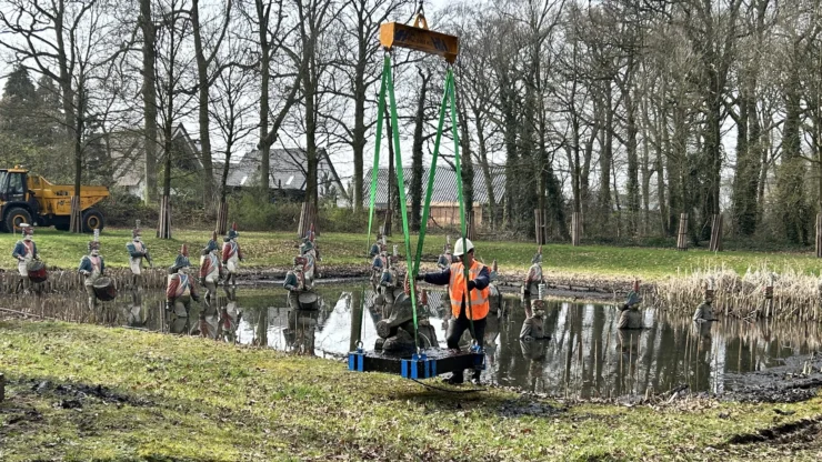 DRUNEN – De soldaten die in de vijver van het voormalige Land van Ooit staan, gaan een opknapbeurt krijgen. De tussen de 1200 en 1500 kilo wegende soldaten waren broodnodig toe aan onderhoud, omdat er al vijftien jaar niets meer aan gedaan was. Op maandag 23 maart werden de eerste soldaten de vijver uit gehesen.