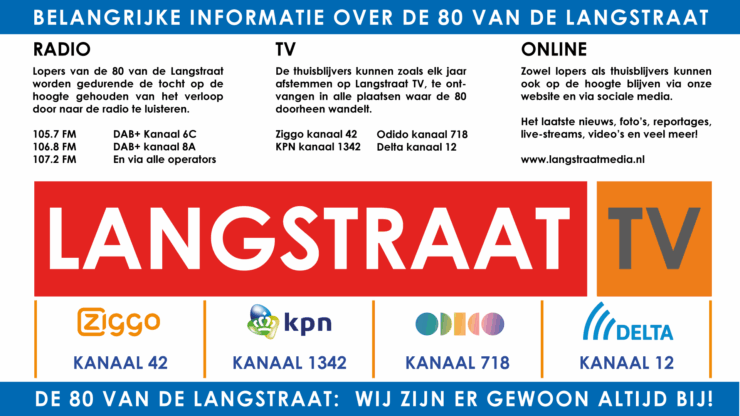 Peters en Gremmé kijken met een bijzonder gevoel uit naar deze Tachtig van de Langstraat: “We zijn sinds 1993 de lokale omroep van de gemeente Waalwijk, en sinds 2007 ook die van de gemeente Loon op Zand. In 2018 kwam daar de gemeente Dongen bij. De inwoners van deze gemeenten konden al naar eerdere edities van de 80 van de Langstraat kijken via Langstraat TV. Sinds 1 januari 2024 zijn we echter ook lokale omroep voor de gemeente Heusden en omdat de 80 vorig jaar niet doorging, is dit dus de eerste keer dat inwoners van Heusden de 80 geheel LIVE kunnen volgen via Langstraat TV! Daar zijn we met z’n allen behoorlijk blij mee.